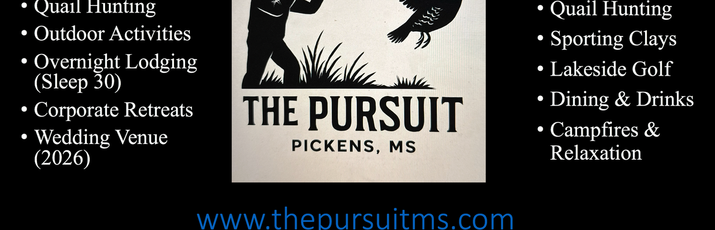 I have started The Pursuit, in Pickens, MS. The purpose of The Pursuit is to provide a safe, family friendly, outdoor venue. The property will be focused on the ultimate hunting experience which includes bird hunting, and sporting clays, as well as lake-side golf, fishing, riding, and other outdoor activities. Good meals and campfires will be a part of the experience. The Pursuit will also be open to corporate retreats, as well as outdoor weddings.